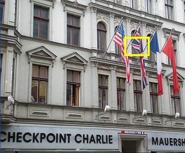 The yellow rectangle highlights how you can tell when the flag is upside down. The broader (wider) diagonal white stripe should be at the top left hand