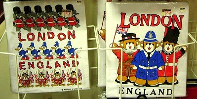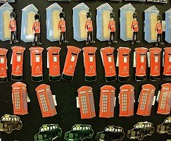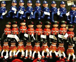Common themes depicted on many English souvenirs include The Royal Family, Policemen, Royal Guards, London Transport, Union Flag and famous London buildings.