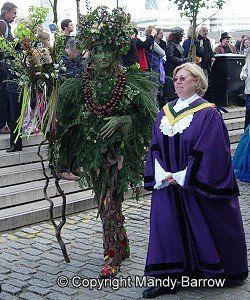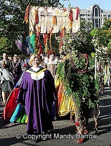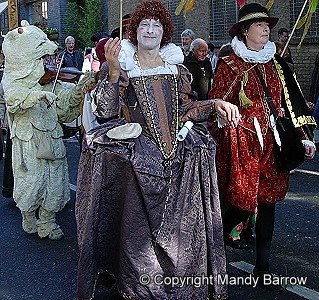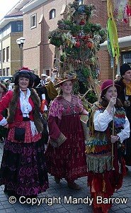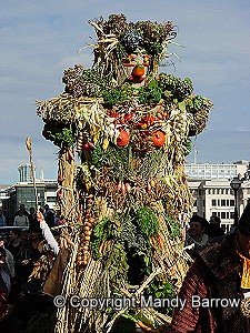 A Corn Queene effigy made from wheat, barley and other grains, and apples, root vegetables and foliage from the Borough Market, is paraded