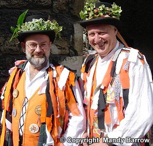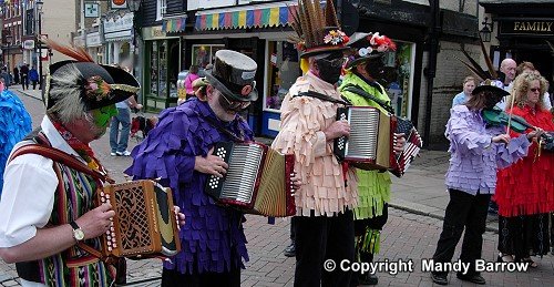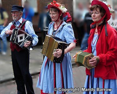 The dancing is very lively and accompanied by an accordion player, a melodeon or fiddle player (Cotswolds) or a noisy band with a drum (Border Morris or North West sides)