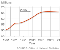 The UK population increased by 7.0 per cent since 1971, from 55.9 million. Growth has been faster in more recent years partly as a result of a greater number of births than deaths, with migration an increasing factor from the late 1990s. . Between mid-1991 and mid-2003 the population grew by an annual rate of 0.3 per cent.